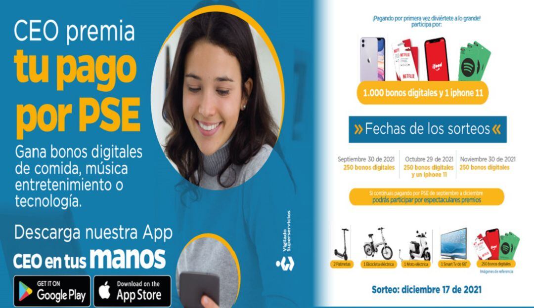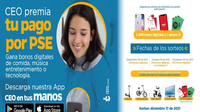 Para los clientes que realicen sus pagos continuos de septiembre a diciembre de 2021, a través de la página web www.ceoesp.com.co/paga-tu-factura o de la aplicación “CEO en tus manos”, entrarán a participar por premios como: una moto eléctrica, dos patinetas eléctricas, una bicicleta eléctrica y dos Smart TV de 55 pulgadas”.