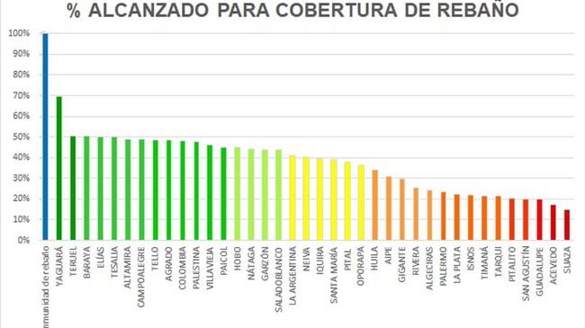 El acumulado total del departamento en ejecución de vacunas para inmunidad de rebaño, con corte al 23 de octubre se encuentra en 33,91% donde se destacan municipios como Yaguará con 69,69%, Teruel con 50,59%, Baraya con 50,33%, Elías con 50,18% y Tesalia con 50%.
