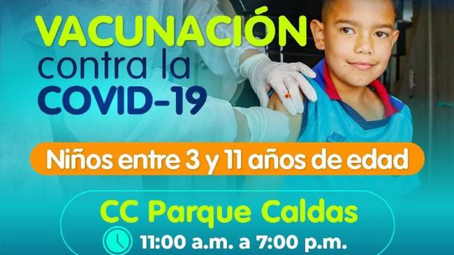 Desde hoy miércoles 3 y hasta el lunes 15 de noviembre, la Secretaría de Salud de Manizales tendrá disponible un punto de vacunación contra la COVID-19 para menores entre los 3 y los 11 años de edad, que estará ubicado en el Centro Comercial Parque Caldas.