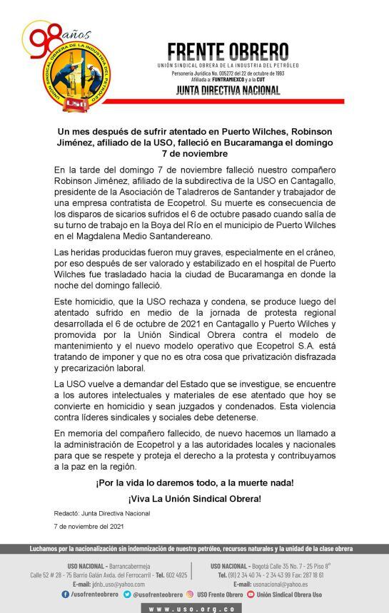 A través de un comunicado la Unión Sindical Obrera confirmó el fallecimiento de Robinson Jiménez, presidente de la Asociación de Taladreros de Puerto Wilches, un mes después de haber sido víctima de un atentado mientras salía de su trabajo en la Boya del Río.
