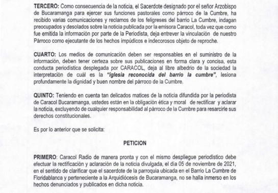 "Como consecuencia de la noticia, el sacerdote designado por el Señor Arzobispo de Bucaramanga para ejercer sus funciones pastorales como párroco de La Cumbre, ha recibido varias comunicaciones y reclamos de los feligreses...". En la comunicación de la Curia se advierte que los fieles "indagan preocupados y desolados sobre la noticia publicada por la emisora Caracol".