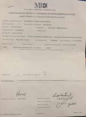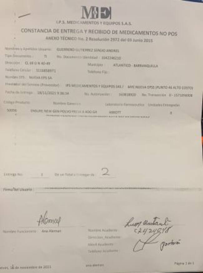 "Desde que se conoció el caso, de manera inmediata NUEVA EPS garantizó la autorización y programación de los suplementos alimentarios, de acuerdo a la cantidad del ordenamiento respectivo, no obstante y al momento de coordinar la entrega con la acudiente del paciente no acepto la misma, por tener un nuevo ordenamiento con una formulación diferente", indicó el comunicado de la EPS.