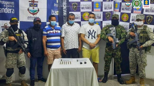 Los dos detenidos mediante tres diligencias de allanamiento y registro en los corregimientos El Polvillo y Buena Seña del municipio de Norosí, sur de Bolívar, fueron identificados como Yorneider Rueda Serrano, alias ‘Mono Franco’, de 27 años; y Jorge Luis Bertel López, alias ‘Bertel’, de 49 años. Por su parte, Miguel Antonio Cuello Mora, alias ‘Kross’, de 32 años, fue notificado en la Estación de Policía del sector Chambacú, donde se encuentra recluido por otro proceso.