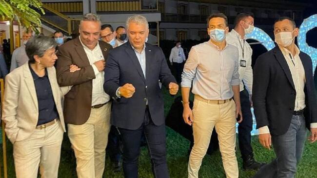 En una de las fotos se observa a la alcaldesa de Bogotá Claudia López con el gobernador del Quindío Roberto Jairo Jaramillo y el presidente Iván Duque abrazados y sin tapabocas.