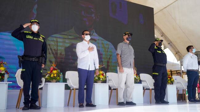 En inmediaciones de la Torre del Reloj en Cartagena, el ministro del Interior, Daniel Palacios; junto al Director General de la Policía Nacional, Jorge Luis Vargas y también con la presencia del alcalde de la Heroica, William Dau, hizo entrega de varias body cams, que ayudarán al fortalecimiento de la seguridad y vigilancia en esta temporada turística en la ciudad.