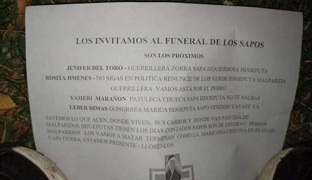 A estas personas a través de un panfleto los están tildando de "guerrilleros" y aseguran en él "sabemos lo que hacen, donde viven, sus carros y donde van".