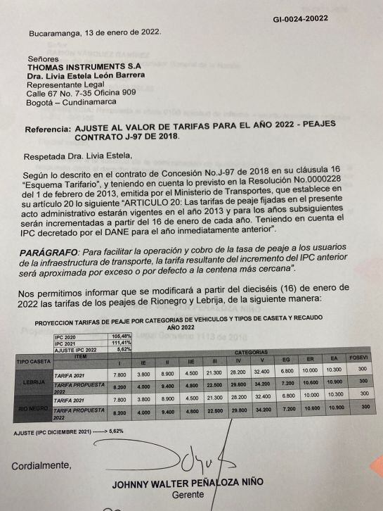A partir de este domingo, 16 de enero, se reajusta y sube el precio de los peajes a cargo del Instituto Financiero para el Desarrollo de Santanderde, Idesan.