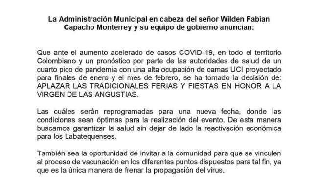 Para esto se emitió un comunicado en donde se indica la preocupación por la alta ocupación de camas UCI, y se indica que “las ferias serán reprogramadas para una nueva fecha, en donde las condiciones sean óptimas para la realización del evento. De esta manera buscamos garantizar la salud sin dejar de un lado la reactivación económica para los habitantes".