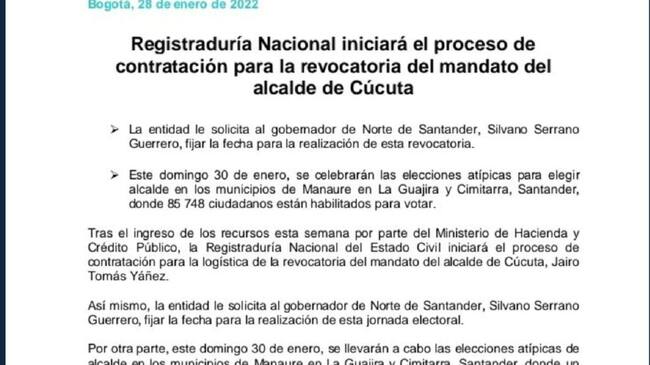 Mediante un comunicado la Registraduría Nacional del Estado Civil, ha informado que se iniciará el proceso de la contratación del personal necesario para la revocatoria del mandato del alcalde de la ciudad de Cúcuta.