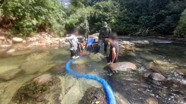 Uno de los operativos se desarrolló en la quebrada El Palo a su paso por la vereda Doña Juana Baja, donde dos hombres de 24 y 31 años de edad estaban extrayendo minerales con una draga sin contar con los respectivos permisos.