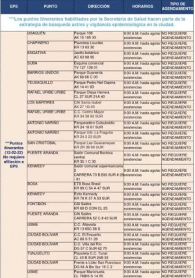 Puntos de toma de muestra PCR habilitados para el 12 de febrero / Alcaldía de Bogotá