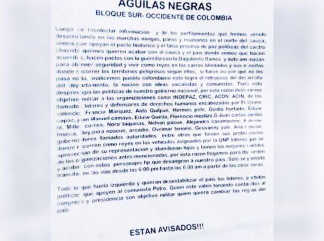 Un escrito firmado por ‘Las Águilas Negras’ amenaza a líderes sociales, indígenas, campesinos, afrodescendientes, candidatos al Congreso de la República y organizaciones como Indepaz y el Consejo Regional Indígena del Cauca, Cric.