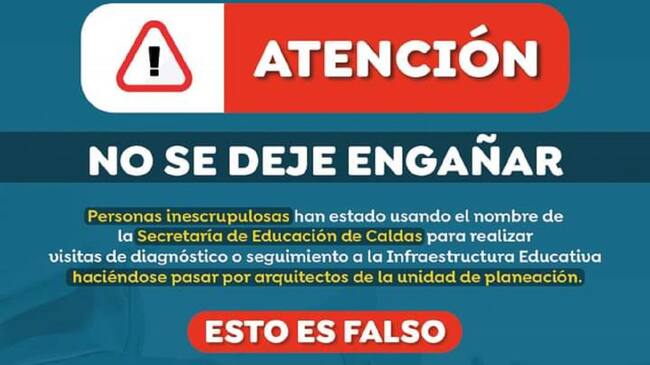 La Secretaría de Educación de Caldas denuncia que hay varias personas inescrupulosas que la están suplantando; ya que realizan en su nombre visitas de diagnóstico o seguimiento a la infraestructura educativa.
