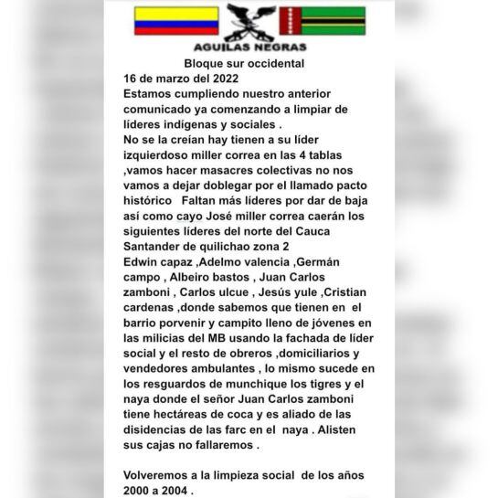 Recientemente, en el barrio Lomas de Granada de Popayán fue encontrado muerto Miller Correa, reconocido líder indígena, cuyo nombre apareció en un panfleto similar, firmado el 7 de marzo de 2022.