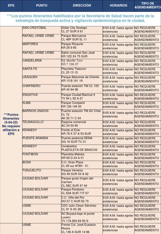 Puntos de toma de muestra PCR gratuita en Bogotá. / Alcaldía de Bogotá