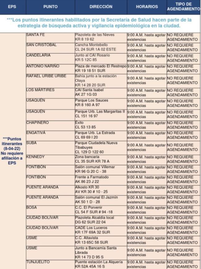 Puntos de toma de muestra PCR gratuita en Bogotá. / Alcaldía de Bogotá