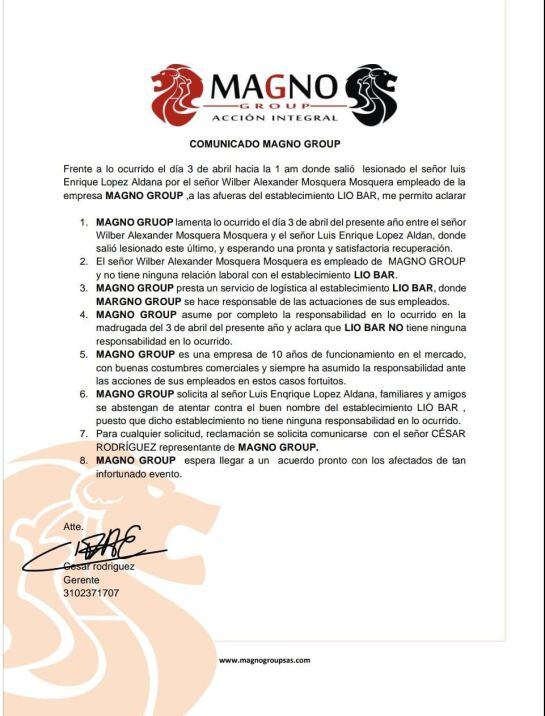 Por su parte, Cesar Rodríguez, gerente de la firma 'Magno Group', en conversación con Caracol Radio, aceptó la responsabilidad por parte de la firma y la de su empleado y confirmó que el guardia de seguridad fue retirado del cargo en el momento en que se conoció lo ocurrido.