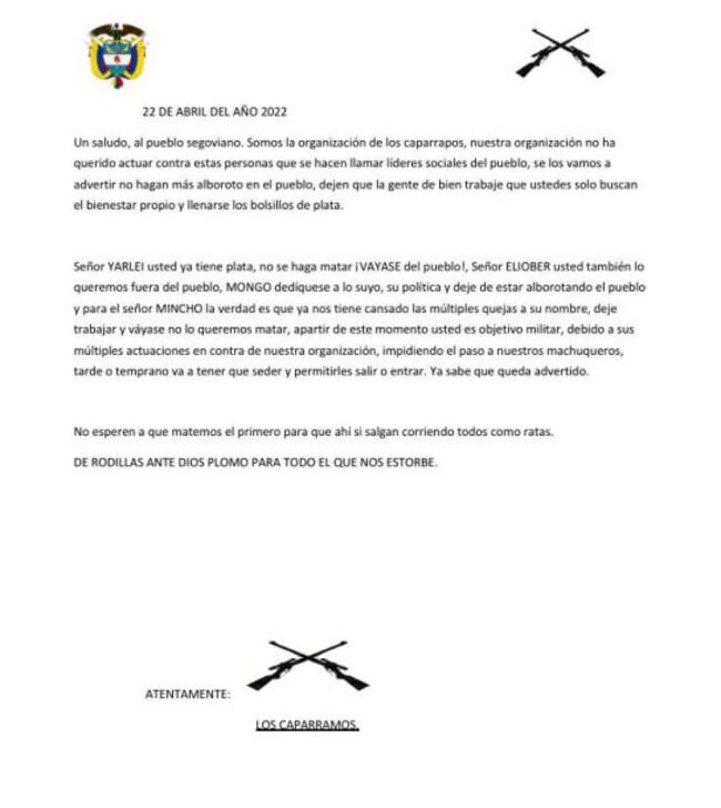 En el escrito declaran objetivo militar a cuatro líderes de la mesa y les exigen que abandonen la zona, acusándolos de no permitir el trabajo de algunas personas, además, los señalan de “armar alboroto en el pueblo y que por ello es la última advertencia”. Esta es la segunda amenaza que reciben de este grupo en el año 2022.