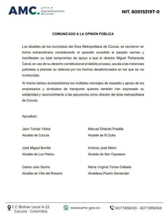 En un comunicado público los alcaldes del área metropolitana respaldaron la permanencia en el cargo del actual gerente del área metropolitana de Cúcuta Miguel Peñaranda, en medio del escándalo en que se vio inmerso por conducir en estado de embriaguez.