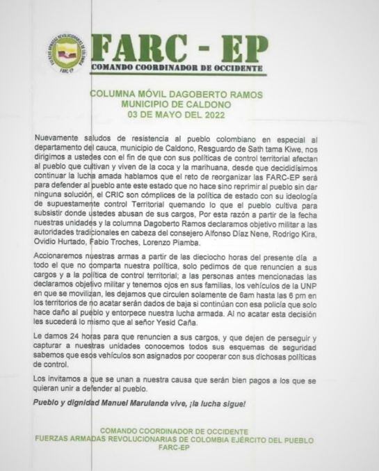 En el texto, los supuestos disidentes advierten que habrá acciones violentas y exigen que se detengan los controles territoriales por parte de la Guardia Indígena en contra de los cultivos de uso ilícito, coca y marihuana.