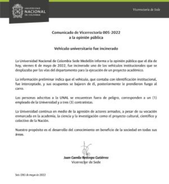 La Universidad Nacional sede Medellín denunció mediante un comunicado oficial de prensa, que en una de las vías del departamento y sin detallar cual, varios hombres pararon el vehículo institucional que estaba debidamente marcado y bajaron a los ocupantes, un empleado de la universidad y tres contratistas, posteriormente le prendieron fuego al carro.
