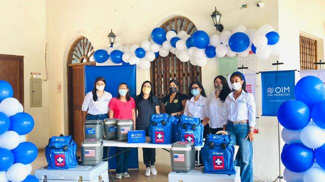 El Departamento Administrativo Distrital de Salud, DADIS, recibió por parte de la Organización Internacional para las Migraciones (OIM) equipamiento para mantener la cadena de frío de las vacunas, entre ellos, 10 termos portavacunas, 10 maletines para transportar los termos portavacunas, 111 ice pack o botellas refrigerantes y 2 cajas térmicas para vacunas.