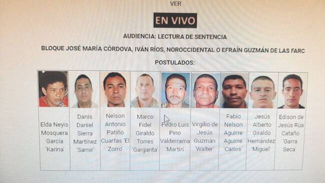 Desde la Sala de Justicia y Paz del Tribunal Superior de Medellín, el Magistrado Juan Guillermo Cárdenas dió inicio a la lectura de la primera parte de la sentencia a la que asistieron la Procuraduría, la Fiscalía, los defensores de víctimas adscritos a la Defensoría del Pueblo y ocho postulados más (exintegrantes de las Farc - EP). Ellos son: Daniel Sierra Martínez, alias Samir, Pedro Luis Pino Valderrama, alias Martín, Nelson Patiño, alias el Zorro, Virgilio de Jesús Guzmán, alias Walter, Marco Fidel Giraldo Torres, alias Garganta, Fabio Nelson Aguirre, alias Carlos, Jesús Giraldo, alias Miguel y Edison Cataño, alias Garra seca.