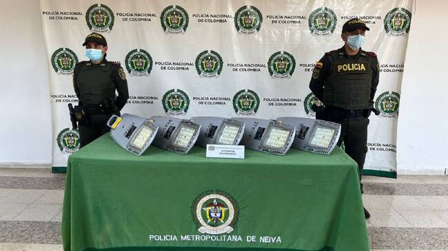 Cerca de cinco las lámparas LED, avaluadas en $1.600.000 cada una, fueron encontradas sobre la avenida La Toma. / Foto Polica Metropolitana Neiva