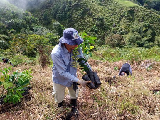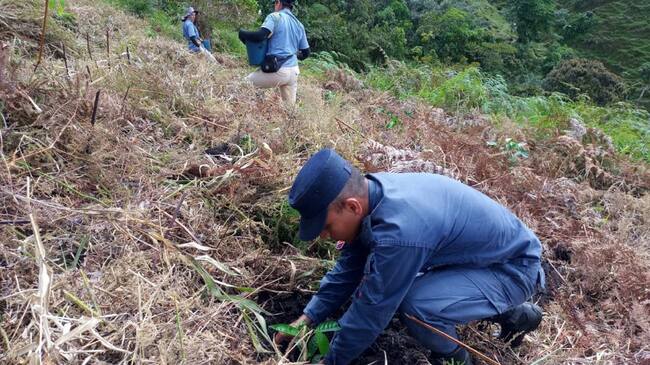 Uniformados del Batallón de Ingenieros de Desminado Humanitario No. 3, con el apoyo de guardaparques del Parque Nacional Selva de Florencia, sembraron 2.000 árboles en una zona que anteriormente estaba afectada por minas antipersonal en Samaná, Caldas.