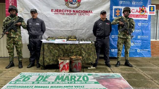 Dichos elementos habían sido enterrados y en su interior fueron encontradas 34 granadas de mano IM-26, 13 granadas de 40 milímetros, un camuflado, un bolso de asalto, eslabones para munición de ametralladora, un tarro de pólvora, una pancarta alusiva a las Farc y un cuaderno de economato.