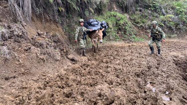 El mal estado de la red vial departamental como consecuencia de las lluvias, obligó que soldados de la VI Brigada del Ejército tuvieran que movilizar el material electoral a lomo de mula en zona rural del municipio de Santa Isabel.