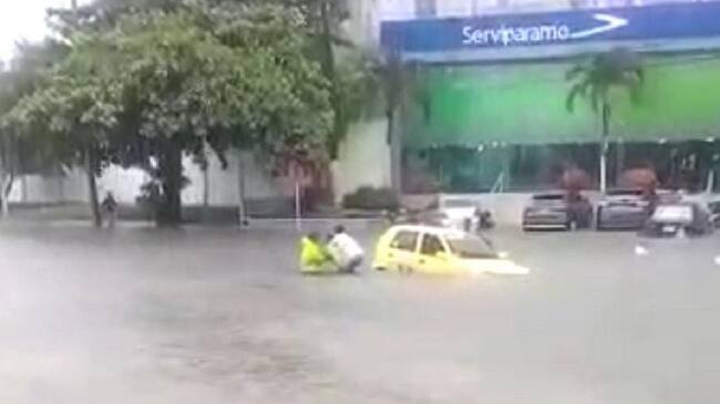Policías rescatan a ocupantes de taxi en medio de un arroyo en Barranquilla