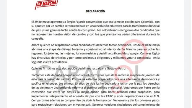 Señala la comunicación “Quienes firmamos esta declaración decidimos respaldar a Gustavo Petro, tomamos esta decisión porque vemos en el rostro y los ojos de la inmensa mayoría de jóvenes de este país la ilusión del cambio. Porque ya estamos preparados para una alternancia democrática y pacífica en el poder”.