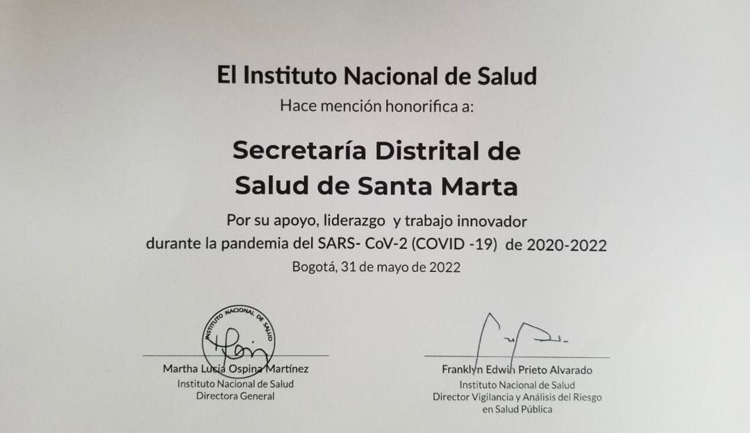 El trabajo que realizó la Alcaldía de Santa Marta y la Secretaría de Salud durante la pandemia ha sido destacada por el Instituto Nacional de Salud, que dio un reconocimiento por el apoyo, liderazgo y trabajo innovador en el periodo 2020-2022, tiempo en que llegó el coronavirus.