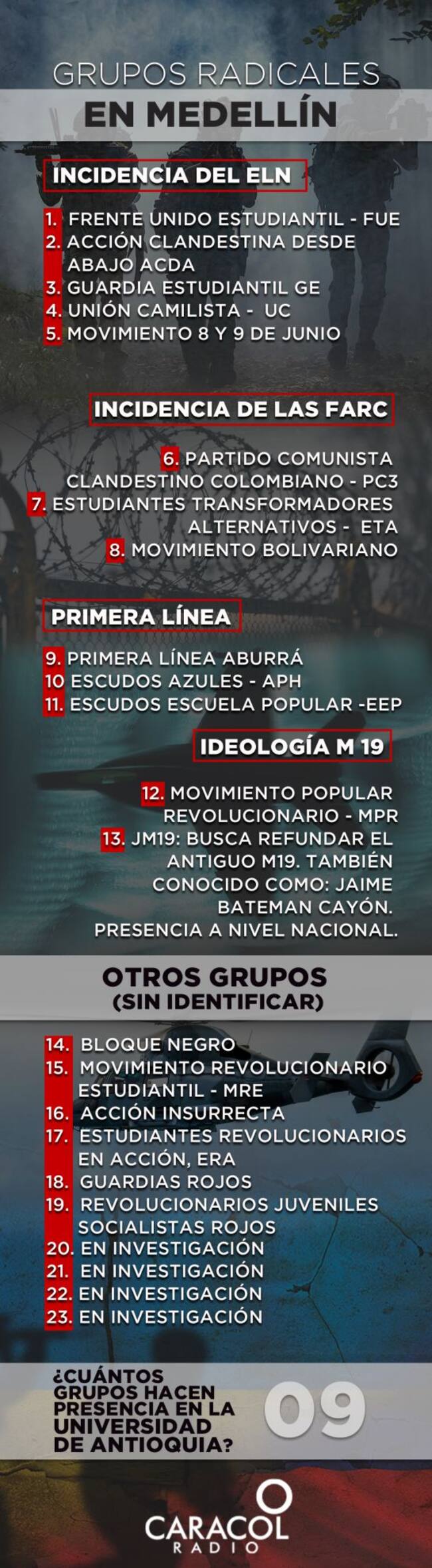 En medio de la compleja investigación, la Policía Metropolitana reveló la existencia de 23 grupos radicales que operan en Medellín, muchos de ellos fueron fundados en universidades públicas y vincularon estudiantes y jóvenes de las comunas de la ciudad, según información reservada a la que pudo acceder en exclusiva Caracol Radio. En el país actúan cerca de 43, lo que significa que en la ciudad la mitad de ellos tienen presencia.