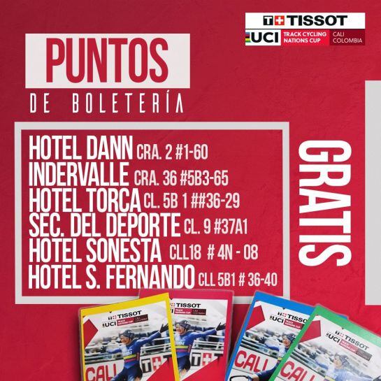 La entrada es gratis, las boletas las pueden adquirir en el Velódromo Alcides Nieto Patiño, Hotel San Fernando, Hotel Sonesta, Secretaria de deporte, Hotel Dann, Indervalle, Hotel Torca.