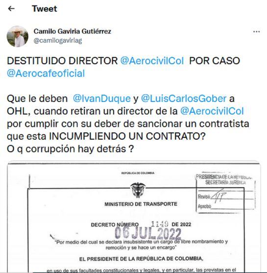 En su cuenta de twitter el corporado indica que este cambio obedece a una deuda que puede existir del presidente de la República Iván Duque y el Gobernador de Caldas, Luis Carlos Velásquez Cardona con la firma OHL que tiene un contrato vigente para la construcción de Aerocafé pero que a la fecha registra incumplimiento y retrasos en la entrega de las obras.