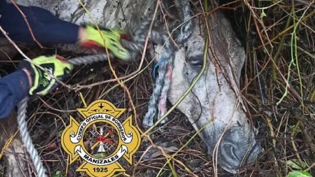 “Se logró llegar al sitio y cortar esta especie, como de alambre de púa que la tenía aprisionada, aparte de eso la enredadera; se le invitó a que saliera ella misma halándola un poco de su cuello, ella salió y por fortuna no presentó heridas graves, fue atendida por su propietario”, explicó el teniente Jorge Iván Quintero, comandante del Cuerpo Oficial de Bomberos de Manizales.