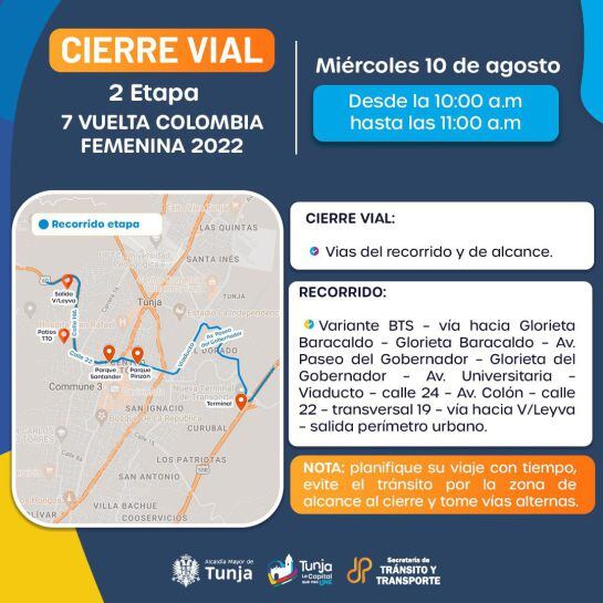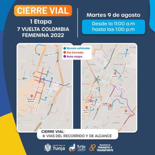 La primera etapa de esta vuelta en bicicleta a Colombia, femenina, estará en Tunja este martes 9 de agosto. Los cierres viales para el martes y miércoles 9 y 10 de agosto, están programados desde las 10am y hasta la 1pm.