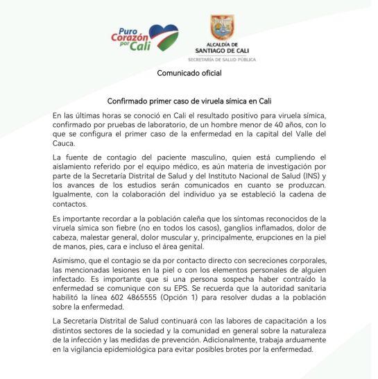 Comunicado Oficial del primer caso de viruela símica en Cali / Alcaldía de Cali