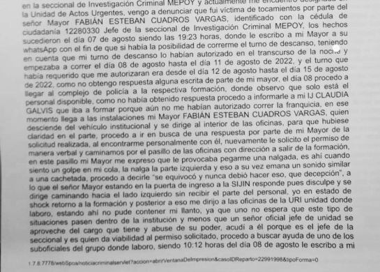 Una patrullera adscrita a la misma unidad aseveró que el oficial le propinó “una nalgada” sin su consentimiento, y cuando manifestó su intención de denunciar lo sucedido, le ofreció una suma de 600.000 pesos, en presencia de otro funcionario, para que guardara silencio.