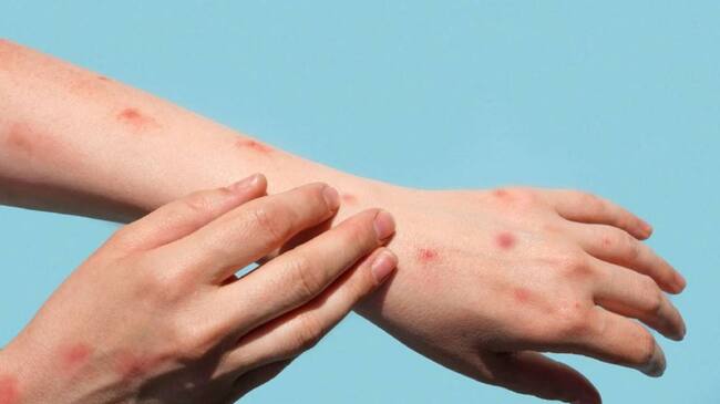 • Lesiones en la piel que pueden inicialmente ser planas o ligeramente elevadas (como ampollas) que se llenan de líquido transparente o amarillento y después forman costra. La erupción en la piel se puede presentar en plantas de manos y pies, cara, bocas y ojos, incluso en área genital y perianal.