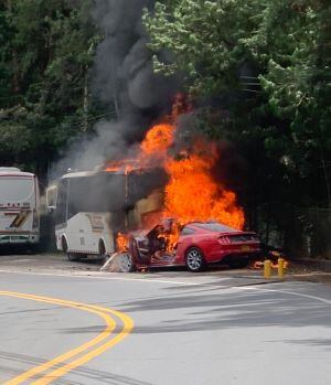 El bus estaba parqueado a un lado de la vía y el automóvil lo chocó por detrás. Los dos quedaron prendidos.