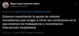 “Yo comuniqué que necesitábamos ayuda en el hospital, que por favor vinieran a ver qué era lo que estaba pasando en el hospital (…) resulta y pasa que los señores dirigentes que están a cargo del hospital se dedican a stalkearle mucho las redes sociales a nosotros, una perseguidera, y desafortunadamente o afortunadamente ellos vieron el tuit que yo hice y me llama en horas de la tarde la jefe de enfermeras a decirme que estoy despedido por el motivo que yo hice ese tuit y que tengo que pasar el lunes por mi carta a la administración”, aseguró Miguel Carbonell Cubides.