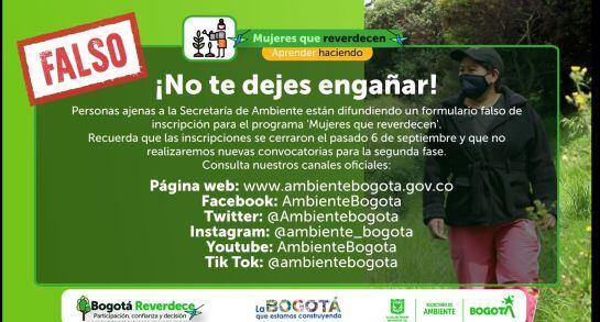 Desde la Secretaría de Ambiente se informó sobre la difusión de falsos formularios de 'Mujeres reverdecen'.
