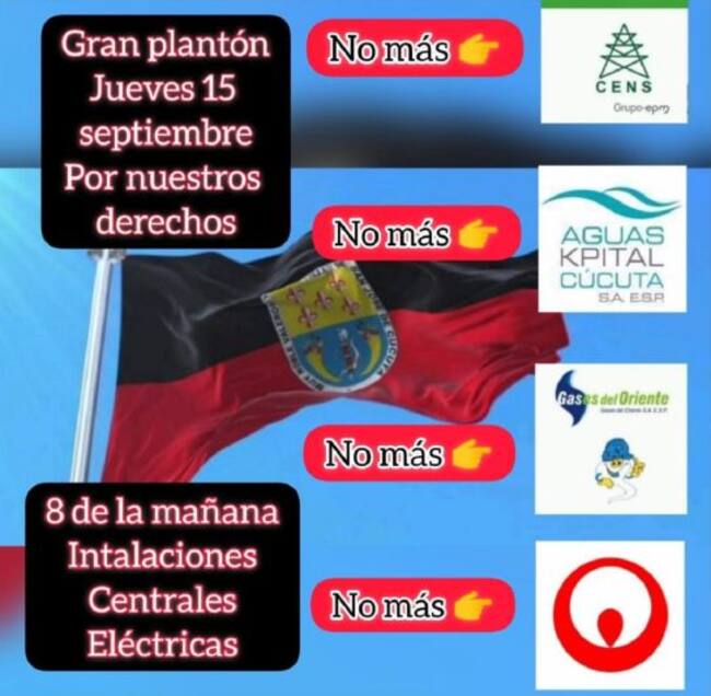 El punto de encuentro será en las afueras de Centrales Eléctricas de Norte de Santander en la zona industrial, buscando convocar a la mayor cantidad de personas desde las ocho de la mañana de este jueves 15 de septiembre.