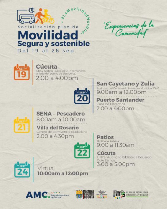 Mediante varias socializaciones en los 6 municipios que conforman el área metropolitana de Cúcuta, se buscara dar a conocer los resultados encontrados en el Plan de Movilidad Sostenible y segura PMSS que busca mejorar los procesos para el transporte público en esta región.