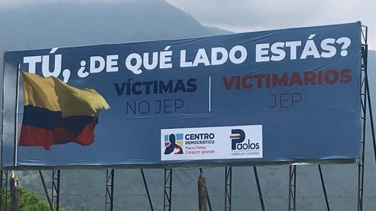En las últimas horas, en la vía Medellín - Bolombolo y en el municipio de Caldas, Antioquia, aparecieron dos vallas del Centro Democrático que invitan a las personas a tomar una decisión con respecto a la JEP. En la imagen se puede leer: "Tú ¿De qué lado estás? Víctimas No JEP - Victimarios JEP"
