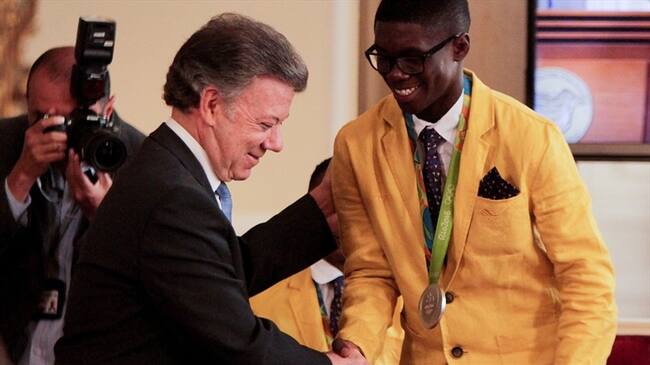 El presidente afirmó que el recorte en el presupuesto para la infraestructura deportiva no afecta los fondos para apoyar a los deportistas | En foto: Juan Manuel Santos y Yuberjén Martínez. Foto: Colprensa(Thot)