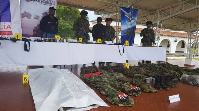 Asimismo, se incautaron siete equipos de campaña, dos brazaletes y pañoletas con insignias del Eln, ocho chalecos multipropósitos, 10 uniformes pixelados, dos pares de botas y tres cintelas.